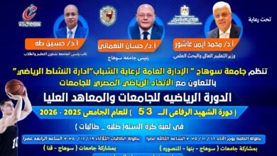 استضافت جامعة سوهاج بطولة كرة السلة للطلبة والطالبات، والتى تقام ضمن فعاليات الدورة الرياضية للجامعات والمعاهد المصرية العليا (دورة الشهيد…